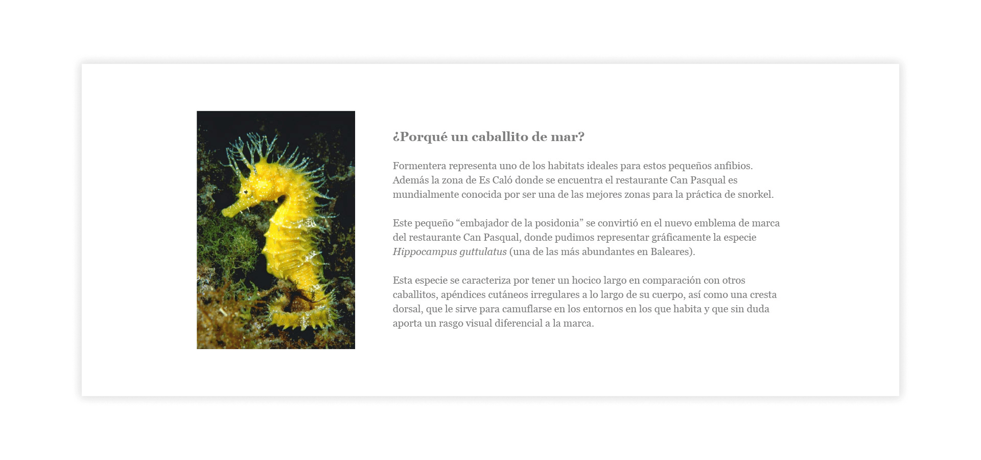 La tipografía potente e impactante transmite historia, mientras que la ilustración a línea del caballito de mar conecta con la zona de Es Caló, uno de los mejores lugares donde se puede hacer snorquel a nivel mundial.