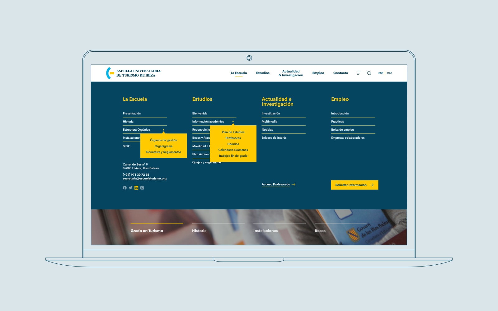 La web de Escuela Universitaria de Turismo de Ibiza llevaba varios años sin actualizarse, y más allá de su diseño y experiencia web, el reto era poder jerarquizar la información de forma que no solo estuviera ordenada y actualizada sino que fuera accesible y fácil de localizar para cualquier usuario.