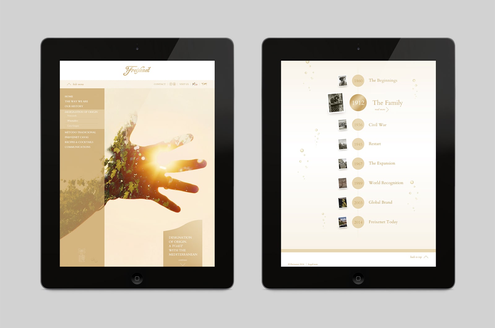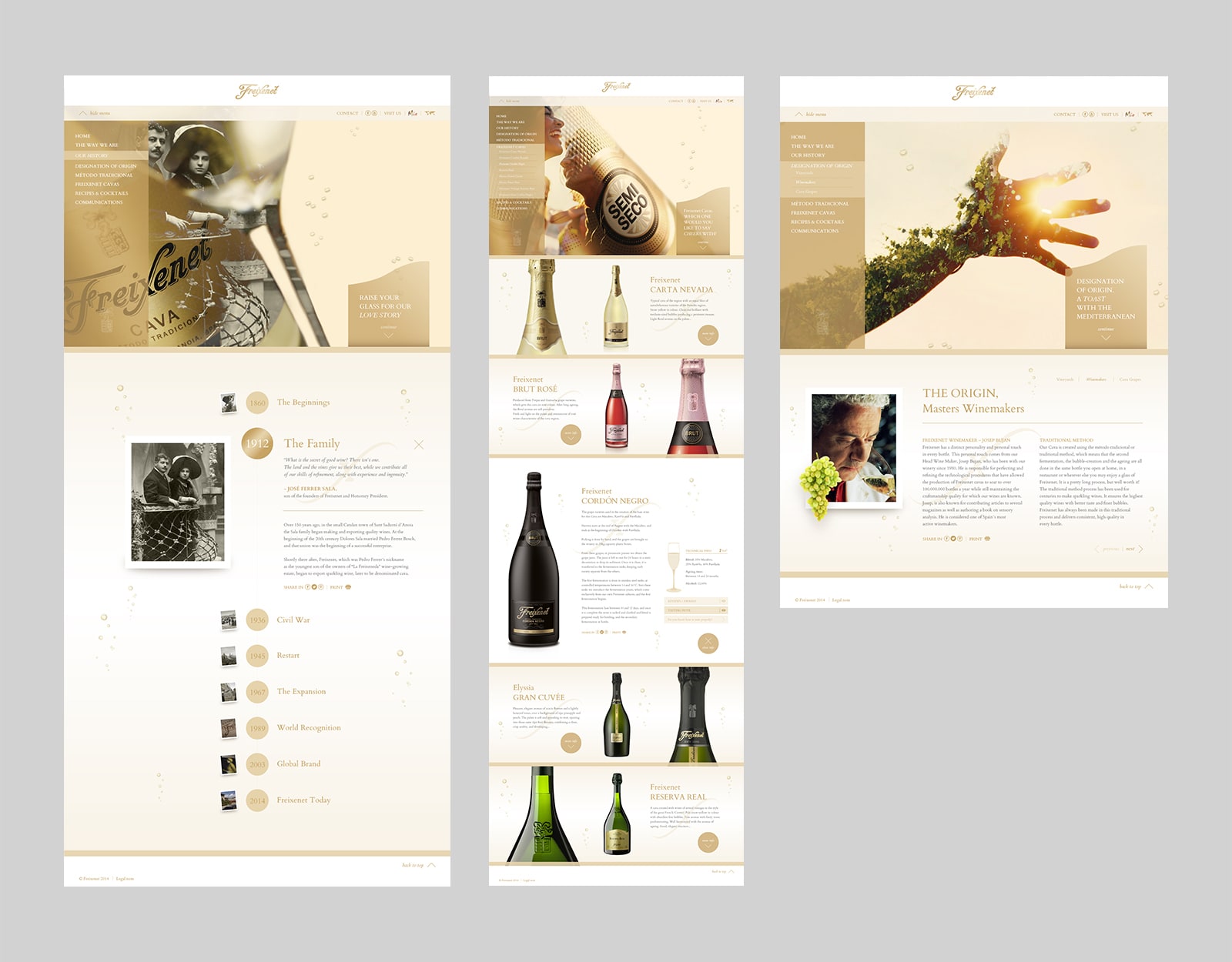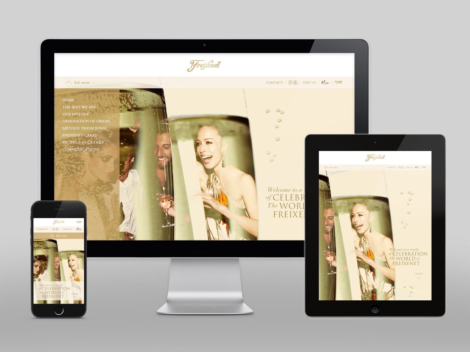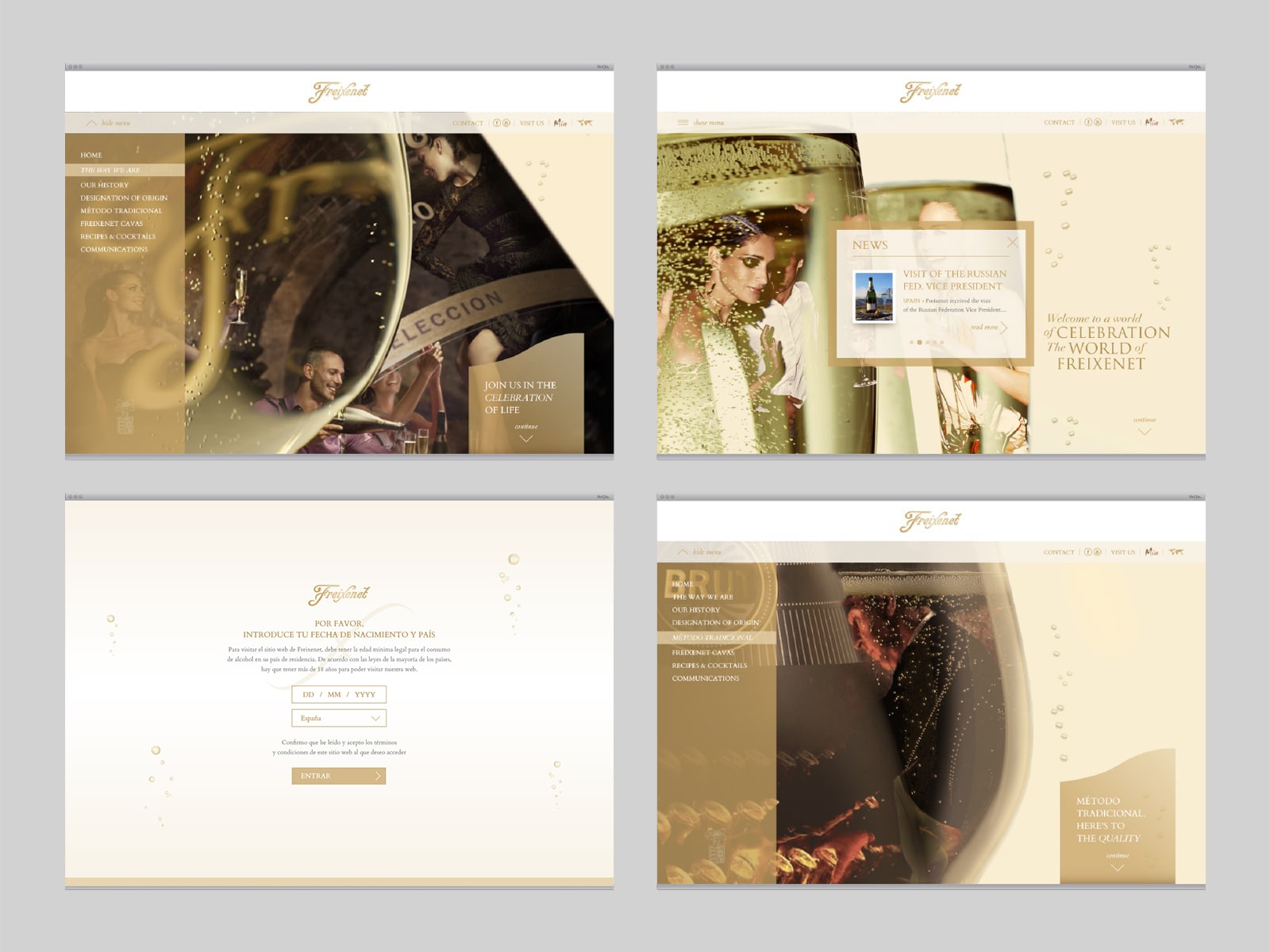 Planteamiento visual de web internacional para la marca global Freixenet, definiendo su arquitectura de información y usablidad junto al desarrollo gráfico de las distintas  secciones web de marca muy visual y con un enfoque altamente corporativo.